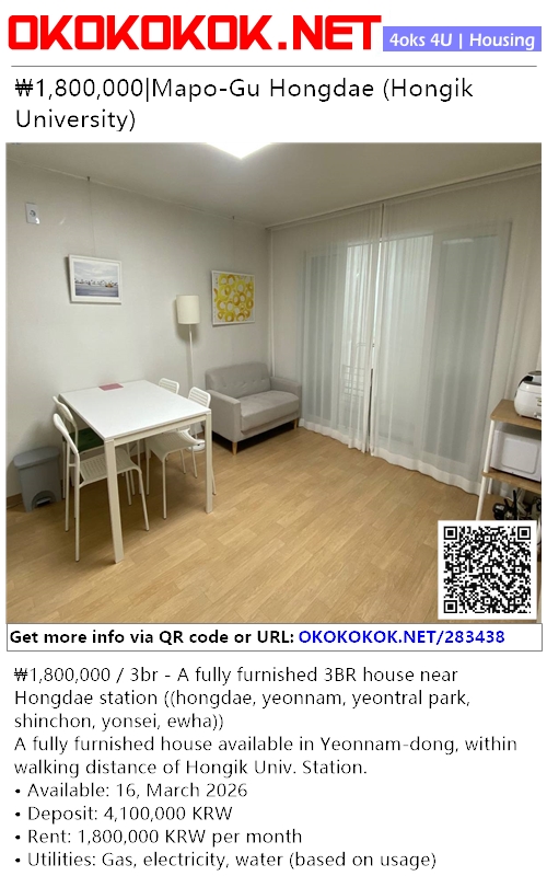 ₩1,800,000 / 3br - A fully furnished 3BR house near Hongdae station ((hongdae, yeonnam, yeontral park, shinchon, yonsei, ewha))