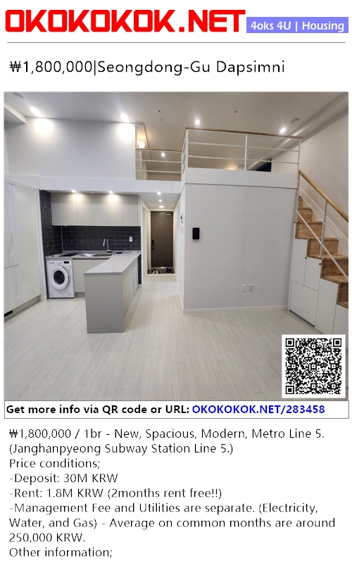₩1,800,000 / 1br - New, Spacious, Modern, Metro Line 5. (Janghanpyeong Subway Station Line 5.)