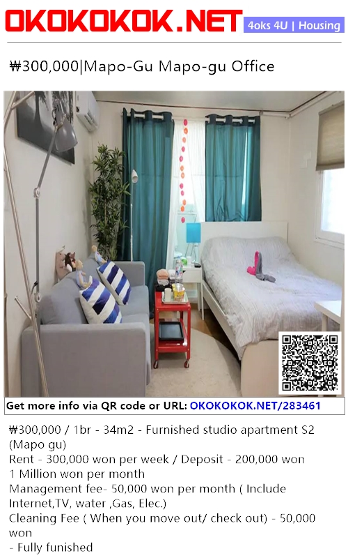 ₩300,000 / 1br - 34m2 - Furnished studio apartment S2 (Mapo gu)