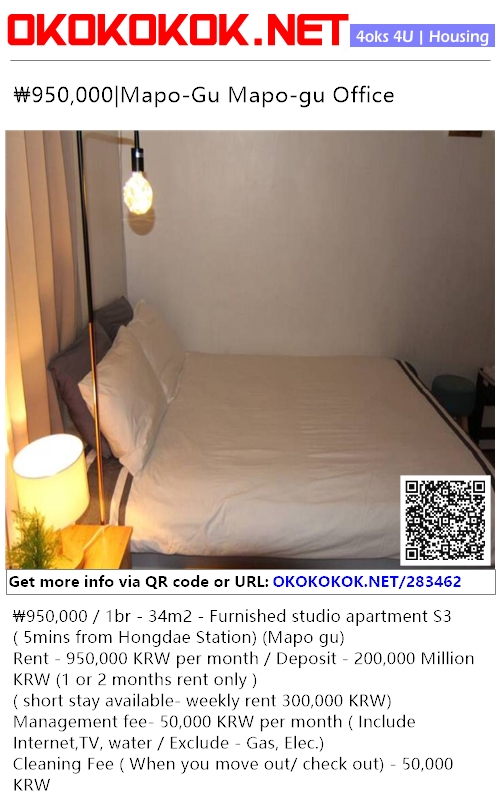 Rent - 950,000 KRW per month / Deposit - 200,000 Million KRW (1 or 2 months rent only )
