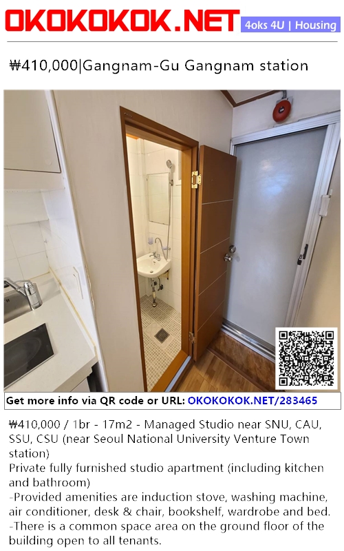₩410,000 / 1br - 17m2 - Managed Studio near SNU, CAU, SSU, CSU (near Seoul National University Venture Town station)