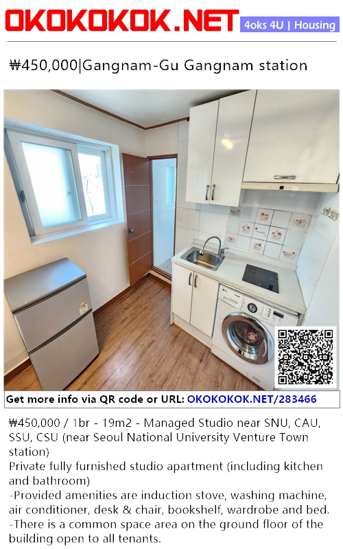 ₩450,000 / 1br - 19m2 - Managed Studio near SNU, CAU, SSU, CSU (near Seoul National University Venture Town station)