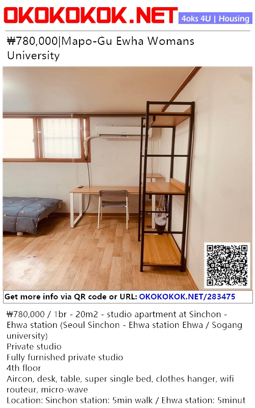 Rent: 780,000wons (6months minimum), rent goes up +150,000wons for less than 6months