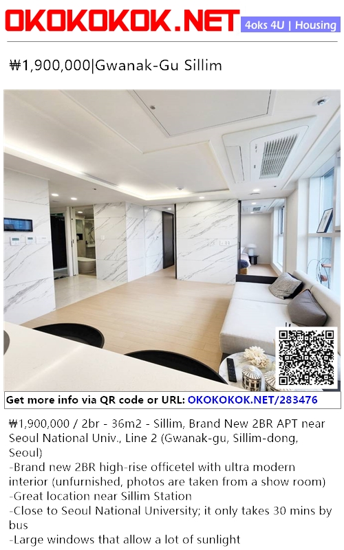 ₩1,900,000 / 2br - 36m2 - Sillim, Brand New 2BR APT near Seoul National Univ., Line 2 (Gwanak-gu, Sillim-dong, Seoul)